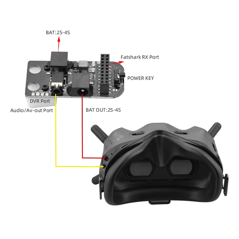 Important parameters:Power input: 2S-4S (DC5.5*2.1)Internal voltage: 5V 3V (with pad can be output)Power output: 2S-4S (DC5.5*2.1)Signal input: standard fat shark receiving port Including third-party receivers: Reaxacc Furious, etc.Signal output: standard audio/video